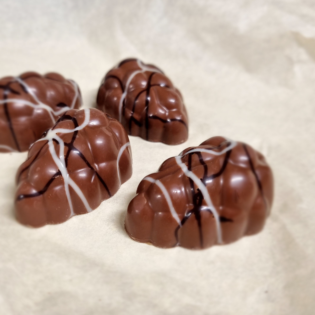 Mjölk choklad pralin fylld med vit chokladganache och hjortron pâte de fruit. En fin kombination av rik choklad och fruktig sötma från hjortron.